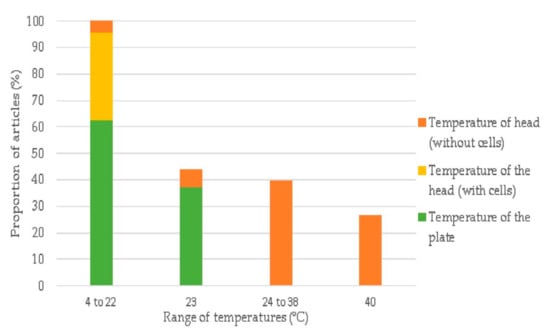 Furthermore, 37.5% of the analyzed articles do not have clear temperature information and that is very crucial for the maintenance of cell viability because variations of those parameters can increase cell viability and, therefore, affect the validation of experiments in the 3D bioprinting field.