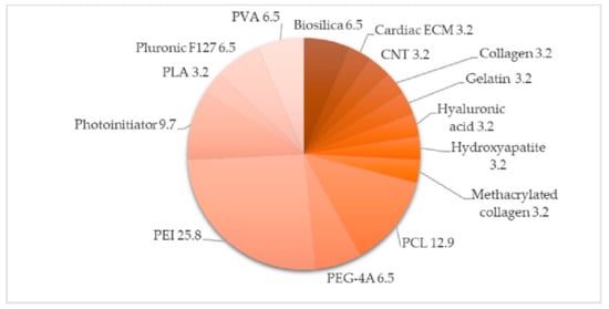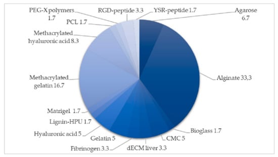 Main materials used for scaffolds bioprinting. The information is represented as percentages (%).