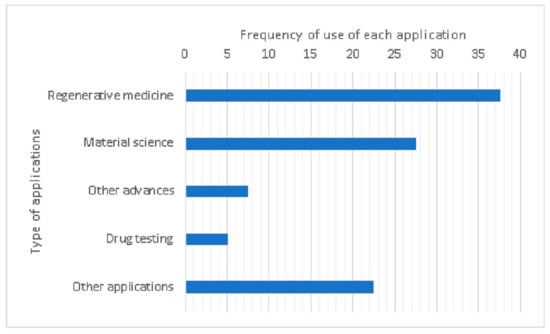 The applications of bioprinting can be classified by their field, such as regenerative medicine, material science, drug testing, and other (i.e., cellular characterization). As illustrated in Figure 5, the main application in 3D bioprinting is regenerative medicine (37.5%). Some examples could be those related to the production of implants for cardiac failure, audition-loss [,], cartilage tissue engineering [,], and human neural tissue construction []. According to the analyzed literature, drug tests are mainly related to the design of cellular models for clinical research. Apropos of material science and other advanced applications, some examples are those related to cell-compatible hydrogel synthesis [], improvements on cell viability maintenance during bioprinting processes [], and the development of new materials such as a combination between lignin and polyurethane []. Other examples related to the medical field, classified as other applications, are cellular characterization [], chemical material characterization [], development of new techniques [,], and gene characterization [].