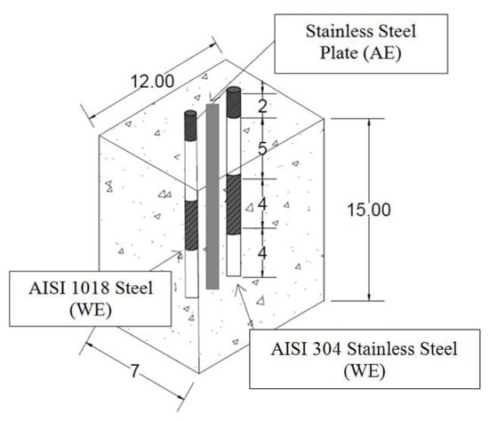 Prismatic concrete specimens with dimensions of 15.0 × 12.0 × 7.0 cm were manufactured with two rebars embedded in the concrete. Table 4 shows the chemical composition of the AISI 1018 CS and AISI 304 SS, both of which were 15 cm in length and 0.95 mm in diameter. Each as-received rebar was partly coated with an anticorrosive paint in order to leave a length of 5 cm exposed to the concrete environment. The concrete was made with a water-to-cement ratio of 0.50. The first two specimens were made with 100% CPC 30R (denoted 4AN (control specimen) and 4AI); the second two specimens were made replacing 20% by weight of CPC 30R with SF (denoted 4BN and 4BI); the third two specimens were made replacing 20% by weight of CPC 30R with FA (denoted 4CN and 4CI). The specimens were cured according to the NMX-C-159 standard [34] by immersion in water for 27 days. After the curing period, the six reinforced concrete specimens were immersed in a 3.5% by weight NaCl solution for 365 days, simulating a marine environment, and they were then subjected to electrochemical tests.