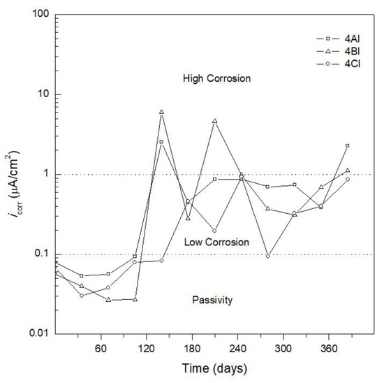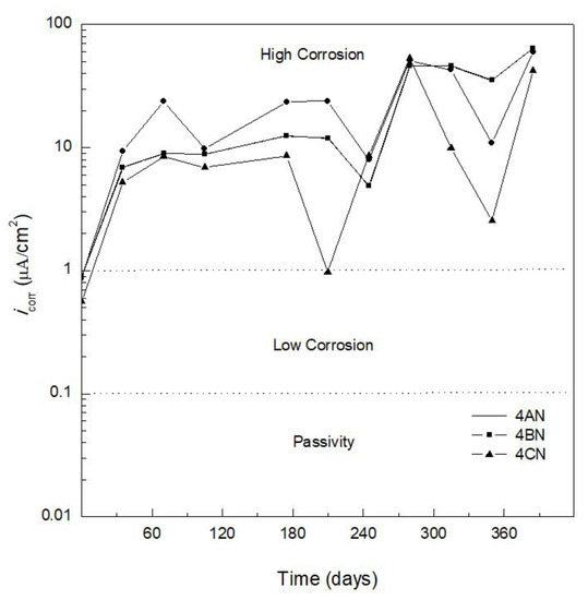 Figure 4 and Figure 5 show icorr versus exposure time. Figure 4 shows AISI 1018 CS embedded in concrete for specimen 4AN (100% CPC) (control specimen), specimen 4BN (80% CPC + 20% SF), and specimen 4CN (80% CPC + 20%FA). The icorr values obtained using Equation (1) could be used to obtain the corrosion rate (CR). As indicated above, the criteria used to analyze the icorr results for specimen 4AN (control specimen) (Figure 4) were based on the state of corrosion of carbon steel in Portland cement-based concrete reported in Reference [41], as shown in Table 6. It was considered that the corrosion criteria indicated in Table 6 could be used to interpret the icorr of the different systems in the present study, for partial replacement of CPC by SF or FA, and for AISI 304 SS reinforcement.