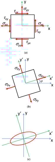 As it is presented in Figure 2a,b, the tensile or compressive stress τ and shear stress τ system can be substituted by the axial stresses with respect to axes that make an angle φ with the original axes. These stresses are called principal stresses and enable avoidance of shear stresses τ in magnetoelastic analyses.