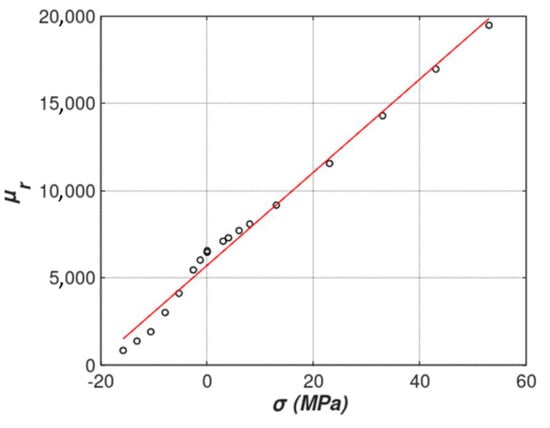 The dependence of relative magnetic permeability µr on the axial stress σ in a ribbon made of Fe73.5Cu1Nb3Si15.5B7 amorphous alloy (VITROPERM® 800). Dependence is approximated by linear function (red). Black circles—experimental results.