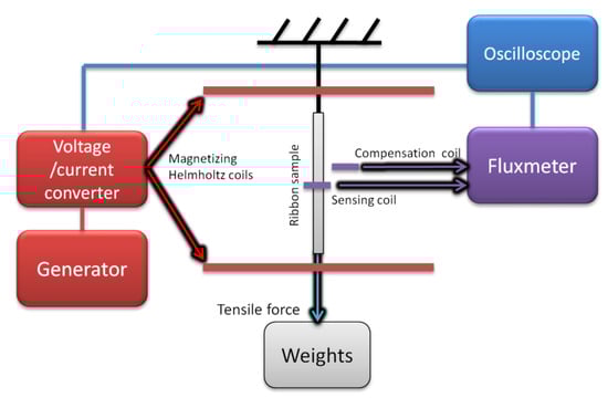 In the first test stand (Figure 5), the amorphous ribbon sample was placed inside a magnetizing Helmholtz coil, which was connected to the voltage/current converter RDM-2a (WUT, Warsaw, Poland), controlled by the arbitrary function generator (SDG1025, Siglent, Helmond, The Netherlands). The AC current induced the magnetizing field H, which in turn produced the magnetic induction B in the sample that was measured by the sensing coil placed around the central part of the ribbon. The sensing coil was connected counter-serial with an identical air-flux compensation coil, and to the fluxmeter (model 480, Lakeshore, Westerville, OH, USA). By varying the tensile stress in the sample with suspended weights, the magnetoelastic characteristics of B(σ||) and µ(σ||) were obtained.