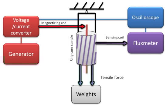 The second test stand (Figure 6) employed the same equipment, but the sample was a ring-shaped ribbon-wound core, wound with sensing winding, with one magnetizing rod passing through its center. The application of tensile force along the axis of the ring core produces magnetoelastic characteristics of B(σ⊥) and µ(σ⊥), which, according to [22], after including Poisson’s ratio can substitute B∥σ magnetoelastic characteristics in the compressive stress region.