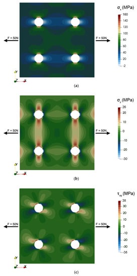 The results of modeling the mechanical stress distribution in the 2D system of tensductor core subjected to tensile force F = 50 N in X direction: (a) σx, (b) σy, (c) σxy.