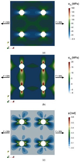 The results of modeling the mechanical stress distribution in terms of principal stresses for the same 2D system of the tensductor core subjected to tensile force F = 50 N in X direction: (a) σPx, (b) σPy, (c) φ.
