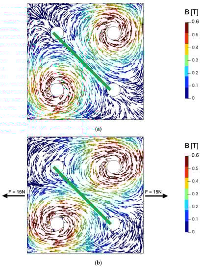 Flux density B vector distribution in the core of tensductor sensor: (a) without stresses, (b) subjected to tensile force F = 15 N in X direction. Green line—sensing coil.