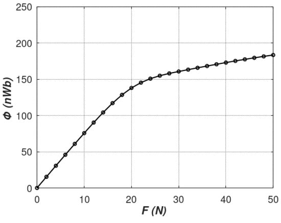 The results of the magnetic flux measured by the sensing coil for incrementally raised tensile force are presented in Figure 12.