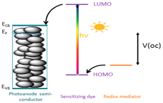 The primary components of DSSCs include a wide band gap mesoporous semiconductor deposited on a conducting glass substrate, a dye sensitizer, an electrolyte containing a redox couple/shuttle, and a counter electrode. The basic working principle of a DSSC and its essential properties has been well documented [28,30,48]. Depicted in Figure 1 is a schematic of the working principles of typical DSSCs.