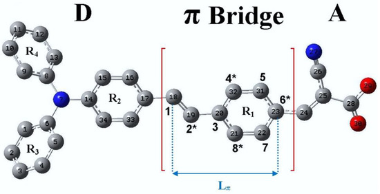 To improve light absorption, new dye candidates aim to reduce the HOMO-LUMO gap whilst concurrently red shifting the absorption spectra of the parent TA-St-CA archetypal dye chromophore. In order to achieve control of the properties of new dyes, a number of positions on the π-conjugated bridge of the TA-St-CA archetypal dye are indexed as star marked and not star marked based on Dewar’s rule, as illustrated in Figure 2. As a result, the new dye structures are obtained by chemical modifications of the backbone of the parent TA-St-CA dye through substitutions around these positions with various electron-donating (ED) moieties and electron-withdrawing (EW) moieties using Dewar’s guidelines. Two ED groups (NH2 and N(CH3)2) and one EW group (CN) are substituted at the appropriate positions systematically one at a time to produce a number of new dye candidates, which are summarized in Table 1. For the complete structures of the new dyes, refer to Table S1 in the supplementary information in [24].