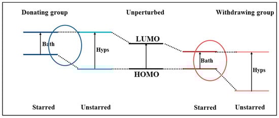 Schematic diagram of starred and unstarred orbitals in the presence of a donating and withdrawing group, according to Dewar’s rules [117]. Adopted from [24] with permission.