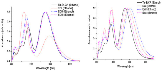 The calculated UV–Vis absorption spectra of the parent TA-ST-CA dye and the computer-designed new dyes ED-I to ED-III and EW-I to EW-III in ethanol solution using the TD-DFT calculations. Adapted from [24] with permission.