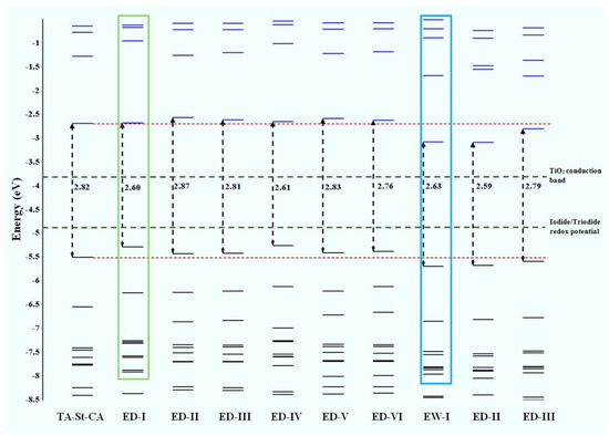 As indicated above, achieving control of the spectral absorption of new dyes requires an understanding of the structural–absorption relationships of the chromophores. Figure 5 provides the frontier orbital energy diagrams of the parent TA-St-CA dye and structurally engineered candidate compounds [34,67]. For the parent structure, orbital energies of the HOMO and LUMO were calculated to be −5.51 and −2.69 eV, respectively, with an energy gap of the HOMO and LUMO of 2.82 eV. In general, substitution by varying the functional groups around the center to form new candidates does not impart a significant reduction in the energy gap of the HOMO-LUMO in comparison to the parent TA-St-CA dye. However, a greater reduction of the HOMO-LUMO gap of the new dyes can be achieved through strategic altering of either the HOMO or LUMO energies. For example, the ED substitutions on the 2*, 4*, and 8* positions of TA-St-CA, and alternatively, the EW substitutions in positions, such as 5 (in new dyes EW-I, EW-II, and EW-III), results in a reduction of the HOMO-LUMO energy gap. The latter is achieved by pulling both the HOMO and the LUMO energies down, which is clearly show in Figure 5. Hence, ED group substitutions at positions close to the donor (D) section of the parent dye can be more effective for the new dyes in DSSCs [24,117]. This approach can be applied as CARD to design other chromophore structures.