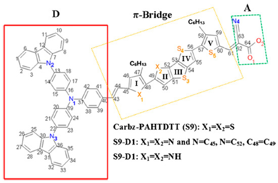 Schematic diagram of the parent dye Carbz-PAHTDTT (S9) and new dyes S9-D1 and S9-D2. Adopted from [25] with permission. Dye S9: X1 = X2 = S. Dye S9-D1: X1 = N = C45, X2 = N = C52 and dye S9-D2: X1 = X2 = NH.
