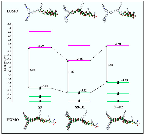 Calculated valence MO energy levels (HOMO and LUMO orbitals) of the dyes, i.e., S9, S9-D1, and S9-D2 dyes. Note: a different model, the CPCM-B3LYP/6-311G(d)//CPCM-PBE0/6-311G(d) model, was also employed [25] in the DCM solution for comparison reasons. Adopted from [25] with permission.
