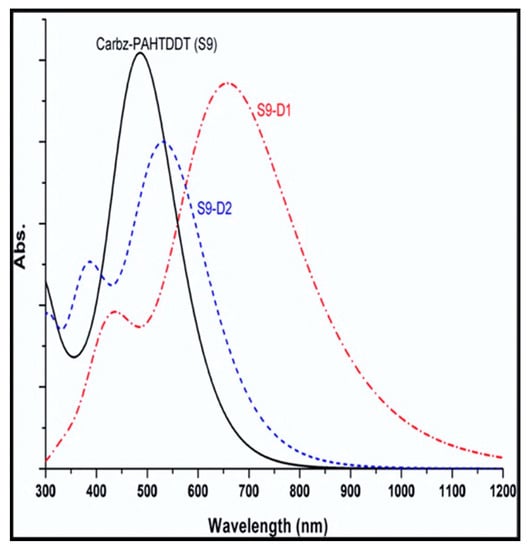 Presented in Figure 8 are simulated absorption profiles of the three dyes examined in this study: S9-D1 and S9-D2 and the parent structure S9 as a reference [25]. Depicted in the figure are one major and two minor absorption bands of the S9 dye centered at λ1 = 668 nm, λ2 = 540 nm, and λ3 = 488 nm, respectively. It should be noted that due to the simulated profiles’ distribution, not all three calculated peaks are discernible in Figure 8. Changes in HOMO-LUMO transitions are apparent for the new dye S9-D1, compared to that of the parent S9 dye, leading to a red-shift of λ1 in the spectrum. Further, a significant red-shift of the λ2 and λ3 bands is also observed for S9-D1 with respect to the position of bands in the S9 dye. For example, the absorption λ1 band in the simulated spectrum of the new dye S9-D1 is significantly red-shifted compared to the parent Carbz-PAHTDTT (S9) dye with broadening of the spectral band (when represented as an absorption profile). This is intensified in the S9-D1 dye, which exhibits significant red (bathochromic) shift and broadening of the absorption profile, effectively enhancing light harvesting—an important criterion for effective chromophores as a surface sensitizer in DSSCs. With respect to S9-D2, there is a minor bathochromic shift of 44 nm in simulated bands for λ1 and λ3 with respect to S9. Conversely, an undesirable hypochromic shift (i.e., blue-shifted to shorter wavelengths) of −32 nm for the λ2 spectral band, however, was also obtained for S9-D2.