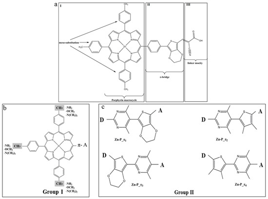 The chemical structure of (a) PZn-EDOT and two groups of derivatives (b) Group I to modify the meso-positions of porphyrin moiety; and (c) Group II to modify the π-linker [26]. Royal Society of Chemistry (RSC Adv.) is acknowledged.