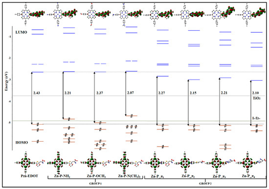 Further, to extend the spectral absorption for DSSC applications, new candidate structures should target decreasing the HOMO-LUMO energy gap and tuning the occupancy and accessibility of low-lying virtual orbitals. This can be achieved by increasing or decreasing the energy of the electronic states of the HOMO and LUMO states surrounding the frontier orbital manifold, respectively. As shown in Figure 11, the four-orbital manifold of the new derivative macrocycle structures has enabled a decrease in the HOMO-LUMO energy gap of the reference parent PZn-EDOT dye (from 2.43 eV), using molecular fragments from both Group I or Group II moieties. For example, for structurally dissimilar derivatives, Group I (Zn-P-NH2) and Group II (Zn-P-π3) are isoenergetic with a HOMO-LUMO energy gap of 2.21 eV, yet they are not isoelectronic, with significant differences in the deeper states surrounding the frontier molecular orbital manifold.