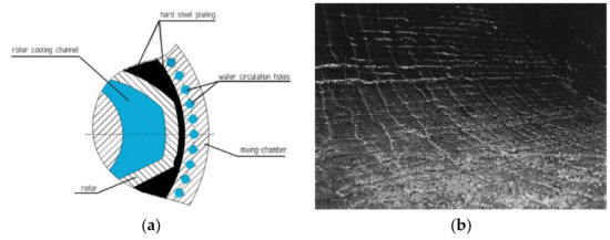 The chamber is an important key part of the mixer. As we know, friction is a double-edged sword. On the one hand, it plays a vital role in mixing and, on the other hand, it can cause metal wear. In the mixing process, when the compound passes between the rotor and the wall of the chamber, the chamber wall will be subjected to intense friction and extrusion from the compound, and the stress is complex. Therefore, the wear of the compound on the mixer wall is also very serious. When the inner wall of the mixing chamber is worn, the gap between the rotor and the inner wall of the mixing chamber has a tendency to expand, resulting in an uneven gap and different sizes. In this case, the rubber will face uneven shear force, which cannot guarantee the dispersion and distribution of carbon in the rubber [5,6,7,8,9]. The abrasion of the chamber wall is shown in Figure 1b.