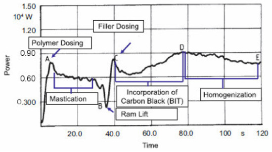 In past experiments it was found that the power curves of whole mixing process was different when they were added to the mixer, and the mixing curve is shown in Figure 2. Dolezal et al. used the so-called “power graph” composed of the power curve of the mixing process and the change curve of the rubber properties as a method to study the mixing process. Hetzel et al. used the power curve and the performance of the compound to select the mixing process conditions. In other words, the friction and wear of the mixer are different in each mixing stage. Therefore, this paper mainly starts from the whole mixing process to explore the change of friction and wear between carbon black rubber composite and metal at every stage.