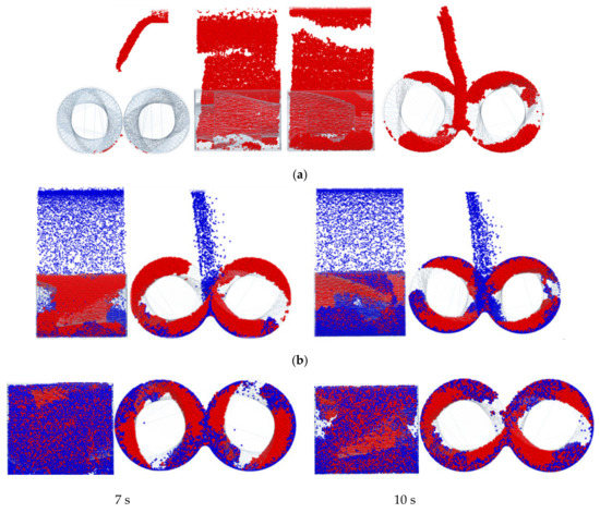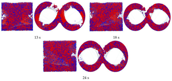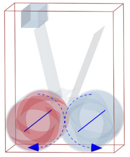 In this paper, there are three kinds of materials, namely, two kinds of granular materials and one geometric model material. In the calculation process, there is contact between particles, as well as between particles and geometry. The calculation of the contact force is based on the contact model. Due to the viscoelasticity of the rubber particles themselves, the particle model adopted is the soft ball model, while the Hertz–Mindlin model with the JKR (Johnson-Kendall-Roberts) cohesion model was used between rubber and rubber particles [11,12,13,14,15,16]. In the mixing process, carbon black itself does not have viscosity, but under the action of the rotor, the rubber was constantly deformed and carbon was covered by rubber, so that the carbon black particles can move with the rubber and finally disperse evenly. Therefore, the Hertz–Mindlin model with JKR cohesion was used between the rubber particles and carbon particles, while the Hertz–Mindlin (no slip) model was used between carbon and carbon particles. We set the red particles as rubber and the blue particles as carbon, the rubber particle radius is set at 0.5 mm, and the carbon particle radius is set at 0.4 mm. Moreover, viscosity parameters are set between red particles, but not between blue particles. Additionally, the viscosity parameter between red particles is 4J/m2 and the viscosity parameter between red particles and blue particles is 2 J/m2.