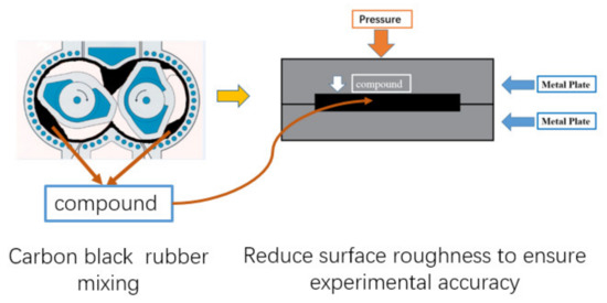 Due to the requirements on the shape of the rubber samples in the experiment, and to ensure the accuracy of the experiment, the test compound samples made will be pressurized through a steel plate. In the test, the friction coefficient is related to the surface roughness, and the mixing degree of carbon black and rubber is the important factor affecting the surface roughness. In particular, the friction coefficient tended to be stable due to carbon black gradually dispersing evenly in the rubber during the later mixing period. However, the surface roughness of the rubber test samples is still different. This is the uncertainty factor which affects the measurement of the friction coefficient in the experiment. Therefore, before the friction test, we put the compound samples into a grinding tool to make the surface roughness as smooth as possible to reduce the test error. The production process of the test piece is shown in Figure 4.