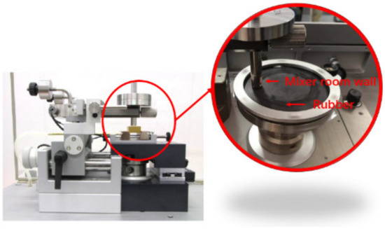 Friction and wear experiments between carbon black rubber composites and metal were carried out by tribometer (Antor Paar, Buchs, Switzerland), and a CSM test for short (shown in Figure 5). After the calibration, the column plate model was chosen. Based on the calculation, we set the experimental pressure as 3 N, and the experiment time as half an hour. In order to accurately test the friction between the rubber and the wall of the mixing chamber during the mixing process, the mechanical test part of the equipment was improved to make the test contact surface the same as the material of the mixing chamber. The friction test joints can be replaced many times to repeat the test to ensure the accuracy of the experiment.
