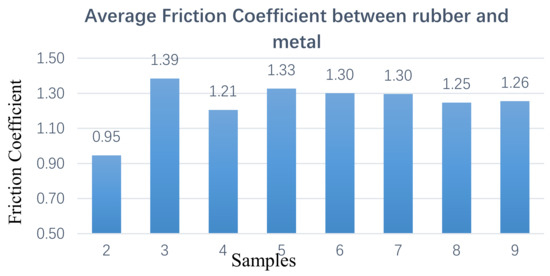 Figure 8 shows the friction coefficient between the rubber and the metal obtained by the CSM test. From the test data in Figure 8, it can be seen that, at each stage, the friction coefficient between the sample and metal is different. The change trend of the friction coefficient is not a single increase, which would have a peak and a flat area.