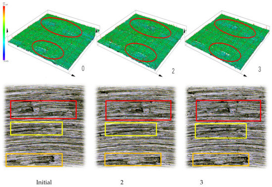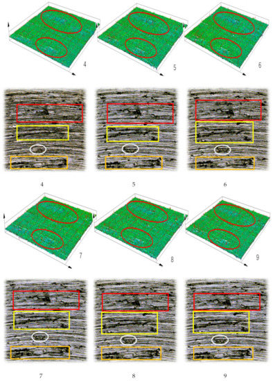 Figure 9 shows that the same location was set for observation, and the three-dimensional image combined with the two-dimensional images were measured with the confocal microscope, so as to measure the volume, V, surface roughness, Sa, surface mean root deviation, Sq, and surface roughness for further comparison. The data is shown in Table 4.