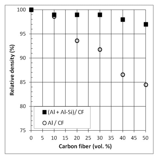 The relative density of the hot-pressed Al/CF composite materials as a function of the reinforcement volume (from 0 to 50 vol.% of CF) is shown in Figure 3. As expected, for the two sets of materials, the relative density decreases when the CF content increases. However, the relative density of set A samples drastically decreases when the volume fraction of CF becomes higher than 20 vol.%. This behavior is related to the increase of porosity located at the intertwining of CFs. However, set B composites, with Al-Si additive, exhibit a higher level of relative density (higher than 97%) than set A. This result confirmed the interest of this semi-liquid process. Indeed, during the sintering with a liquid phase, Al particles as well as CF rearrangement can take place and the Al-Si liquid phase can also flow around the grains and infiltrate the pores created by the intertwining of CF.