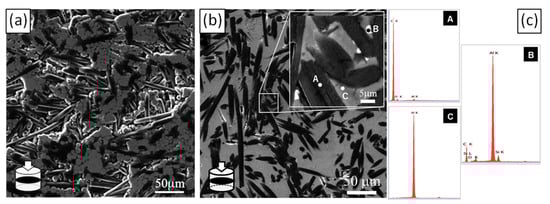 SEM micrographs of (a) (Al/CF)50vol% and (b) ((Al + Al-Si)/CF)50vol% composites in a plane perpendicular to the hot-pressed direction (in plane) and (c) EDS spot scan in ((Al + Al-Si)/CF)50vol% composite.
