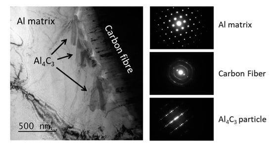 To overcome the presence of this alumina layer, many liquid-phase methods (e.g., infiltration, stir casting) have been developed. These methods improve the wettability between matrix and reinforcement and allow the fabrication of MMC with high reinforcement volume ratio and low porosity ratio. However, during the fabrication process, a large amount of Al4C3 phase is formed at the matrix–reinforcement interface. Due to its low thermal conductivity and intrinsic brittleness, the formation of excessive Al4C3 interfacial phase is detrimental to the final properties and reliability of the Al/C composite materials [10].