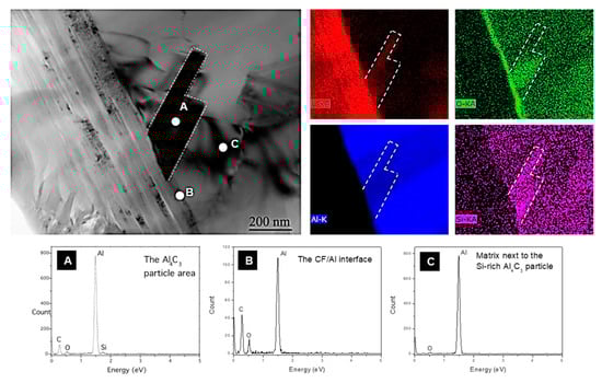 TEM micrograph, EDX mappings and spot analyses of an Al4C3 carbide crystal in ((Al + Al-Si)/CF)50 vol.% composite. (A), (B) and (C) correspond to the spectrums of the EDX spot analyses in zone A, B and C respectively.