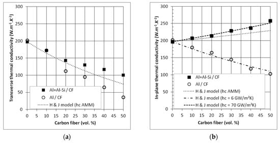 In the transverse direction (z) (Figure 7a), we measure a decrease of the TC with the increase of CF ratio for both sets of samples. In addition, the TC values of Al/CF composites are lower than the TCs of the (Al + Al-SI)/CF one. Therefore, the behavior of the transverse TC of the composite is related to the intrinsic properties of the reinforcement (see Table 1). The lower thermal conductivity of the Al/CF composites, with respect to the (Al + Al-Si)/CF one, can be attributed to the presence of porosity located at the Al-CF interfaces which increase the thermal boundary resistance.