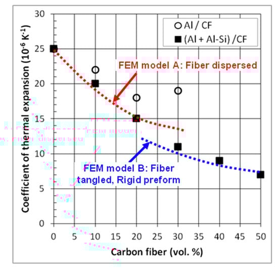 The calculation of the CTE values in composite materials is not straightforward. It is known that the CTE does not follow the classical rule of mixtures due to presence of thermal stresses at the matrix–reinforcement interfaces [6,7]. Several models are reported in the literature for the CTE of composite materials containing continuous fibers as reinforcements [23,24]. However, these models cannot be applied for short fiber containing composites. Therefore, we have developed a finite element method (FEM) for calculating the CTE of such composite materials [25]. This FEM is in fact made of two models in order to take into account the percolation threshold of the CF in the Al matrix. Model A corresponds to a composite without CF tangles and model B a composite with tangles of CF. The comparison between the experimental and calculated CTE of (Al + Al–Si)/CF composites is shown in Figure 8. It shows that the separation into two models for calculating the CTE is actually pertinent to correctly take into account the evolution of the CTE with the fiber content. Calculated values of CTE obtained with FEM model B are smaller than those determined by FEM model A. It clearly shows that the tangles of the carbon fiber contribute to further improve the CTE in (Al + Al–Si)/CF composites. In addition, it seems that the remarkable low CTE of the carbon fibers has been transferred into the Al matrix and contributes effectively to the low CTE of the composite materials.