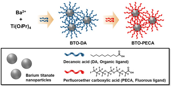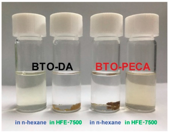 2.2. Ligand-Exchange Reaction of BTO-DA to BTO-PECA (Perfluoro-3,6,9-trioxatridecanoic Acid-Capped BTO Nanoparticles)