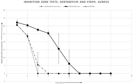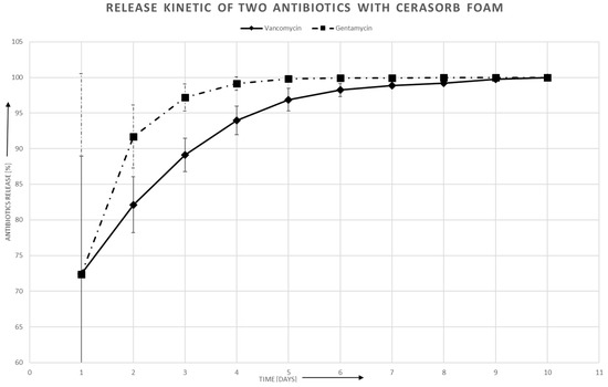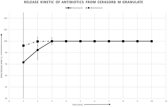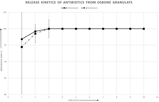 For the successful treatment of the infection, particularly when glycosides were used [11], is the amount of the active agent released from the donor decisive in order to reach the minimum inhibitory concentration (MIC) [12]. It is considered that a concentration 8–10 times higher than the MIC would be required for an effective antibiotic function [13]. The MIC is estimated at 1 µg/mL for Gentamycin and 2 µg/mL for Vancomycin. After 24 h a biofilm is formed. The Minimum Biofilm Eradication Concentration (MBEC) is up to 51,200 times higher than MICs. The MBEC of Gentamycin is 6400 µg/mL and of Vancomycin 3200 µg/mL [14].