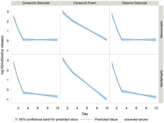 Generally, the slope is steeper in the first days than later on for all biomaterials. Table 4 and Table 5 show that the difference with Cerasorb® Foam is only 0.2 to 0.3 for both antibiotics. There is a significant difference in intercept and slope between Gentamycin and Vancomycin with the granular biomaterials, with Gentamycin having on average 0.67 higher intercepts (p = 0.009), steeper slopes in the first part (difference = −0.40, p = 0.0008), and more gentle slopes in the second part (difference 0.34, p = 0.008). There was no significant interaction effect of antibiotic and material, i.e., the fitted lines for Gentamycin and Vancomycin are almost parallel (Figure 5).