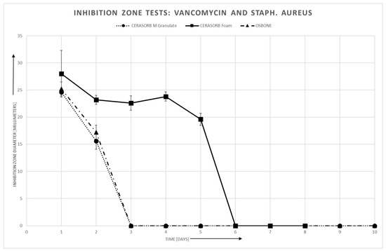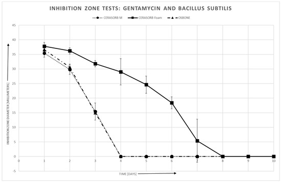After the inoculation step, the supernatant was discarded and the pellets were incubated in 10 mL phosphate-buffered saline (PBS), pH 7.4, at 37 °C for 24 h. The release kinetics of each of the two antibiotics was measured in multiple test runs (n = 5) on 10 consecutive days. Each day, the supernatant was taken from the solution. One hundred microliters was used for disk diffusion, and the rest of the solution was preserved at −80 °C for subsequent determination of the antibiotic concentration. The pellets were washed with PBS and then, again, 10 mL PBS were added, followed by subsequent incubation.