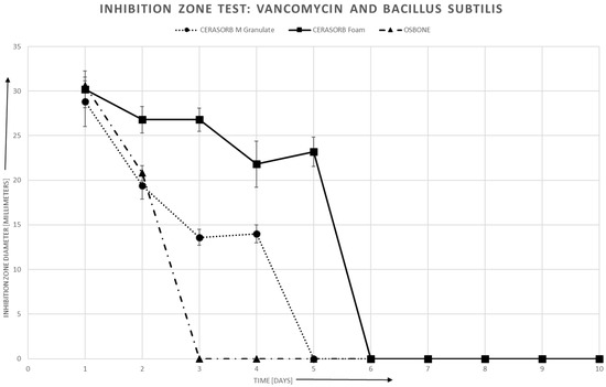 For disk diffusion, a bacterial suspension of the test organisms Bacillus subtilis ATCC 6633 and Staphylococcus aureus ATCC 25923 was adjusted using a McFarland standard of 0.5 in 0.9% sterile saline and streaked over the whole surface of a Columbia blood agar plate with a sterile swab. One hundred microliters of the supernatant of the incubated bone graft substitutes was transferred in the middle of the plate. After overnight incubation at 35 ± 2 °C, the zone diameters were measured.