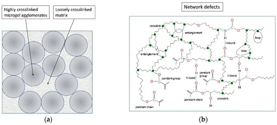 The structural heterogeneity of dimethactylate polymer networks: (a) schematic representation of the morphology; (b) defects in the polymer network microstructure.