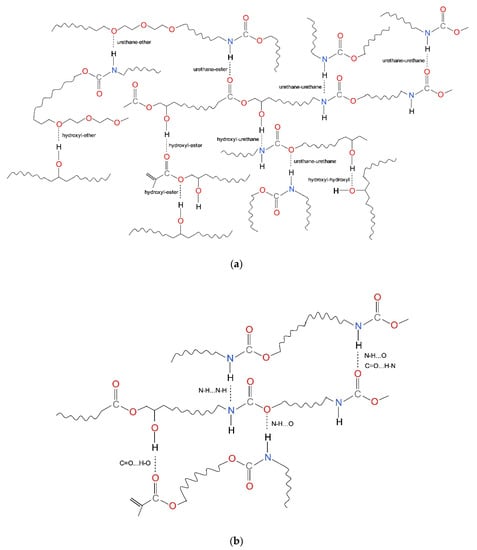 Hydrogen bonds in dental dimethactylate polymer networks (based on [76]): (a) various possibilities for hydrogen bonding; (b) hydrogen bonds narrowed to examples presented in Table 3.