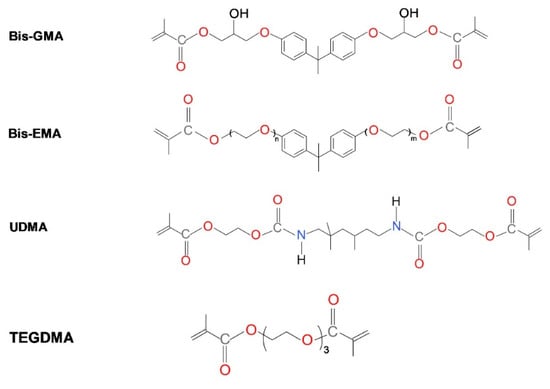 Secondly, the dimethacrylate monomer molecular elasticity determines the general network elasticity [21,22]. Aliphatic hydrocarbon and oligoether chains give rise to an increase in polymer elasticity, whereas cycloaliphatic and aromatic units cause an increase in polymer stiffness [31,32,48,54,55,56].