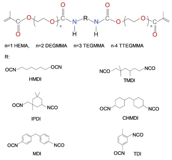 A study of Barszczewska-Rybarek on a series of new urethane-dimethacrylates (Scheme 2) provided knowledge on the influence of the diisocyanate core chemical character and the oligoether chain length on the DC in homopolymers [90]. The DC in fully aliphatic polymers was found to be higher than the DC in polymers having aromatic and cycloaliphatic moieties. The presence of aromatic rings caused a greater decrease in DC than alicyclic structures. Monomers with asymmetrically substituted rings polymerized to higher DC when compared to those having symmetrically substituted rings. Additionally, the DC was closely related to the length of the oligooxyethylene chain, present in the monomer wings. The longer the chain, the higher the DC. However, monomers having tetraoxyethylene chains revealed a slight decrease in DC. The initial increase in DC was explained by the increased flexibility of monomer molecules. An increase in the possibilities of rotational conformations facilitated reaction-diffusion [2]. The final drop in DC was explained by a significant decrease in the concentration of double bonds, causing their remoteness. Park et al. studied DC in a series of copolymers of Bis-GMA with oligoethylene glycols dimethacrylates. The same as above, they found that the higher the number of oxyethylene units in a chain, the higher the DC [52].