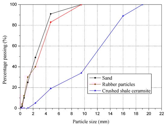 Grading curves of sand, rubber particles and crushed shale ceramsite.