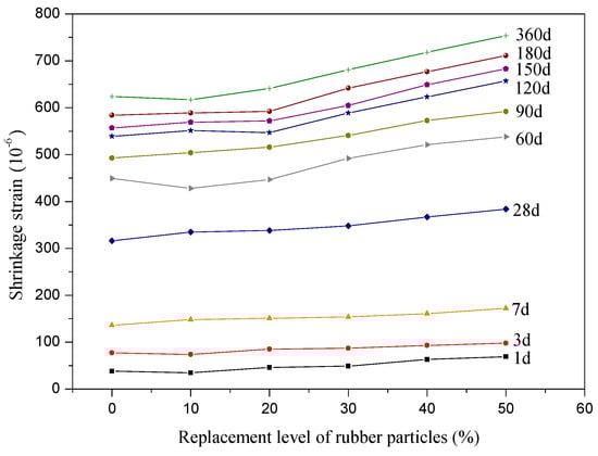 - The shrinkage strains of SCRLC increased with an increase of rubber particles substitution percentages. Most increment of shrinkage strain of SCRLC occurred during the age of 3–120 days. Compared with the plain sample, the shrinkage strain of SCRLC increased from 624 × 10−6 to 754 × 10−6 as rubber particles substitution percentage increased from 0% to 50% at an age of 360 days.