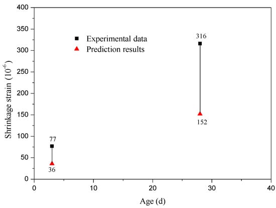 After analyzing the above shrinkage predictive models, it could be detected that the shrinkage prediction value calculated by ACI 209 model, GL 2000 model, fib Model Code-2010, B3 model and China Academy of Building Research model were all total shrinkage which included drying shrinkage and autogenous shrinkage. Compared to the above models, it could be seen that China Academy of Building Research model was much simpler than the other models, and the factors considered in this model was much more close to the experimental design. In addition, the China Academy of Building Research model was also utilized to predict the shrinkage strain of LC in JGJ51-2002 [34]. Therefore, the China Academy of Building Research model was tentatively selected to describe the shrinkage properties of SCRLC in this research. According to JGJ51-2002 [34], for LC, a = 78.69 and b = 1.20 at age of 3 days; meanwhile, a = 120.23 and b = 2.26 at age of 28 days. It meant that prediction of shrinkage strain of concrete at different ages would utilize different parameters a and b.