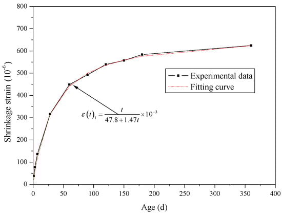 Through fitting analysis of experimental shrinkage strains of SCLC by MATLAB software (seen in Figure 5), the parameters a and b in basic equation of shrinkage of SCRLC were 47.8 and 1.47, respectively. The basic equation of shrinkage of SCRLC ε(t)1 could be expressed as follows: