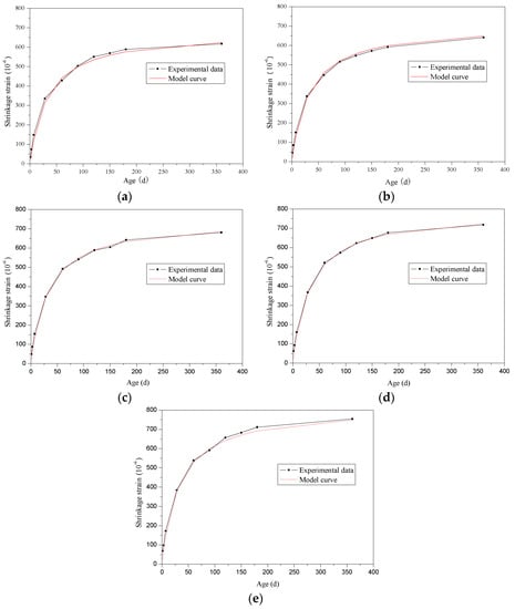 Comparison of shrinkage strains of SCRLC obtained from experiment and fitting: (a) SCRLC10; (b) SCRLC20; (c) SCRLC30; (d) SCRLC40; (e) SCRLC50.